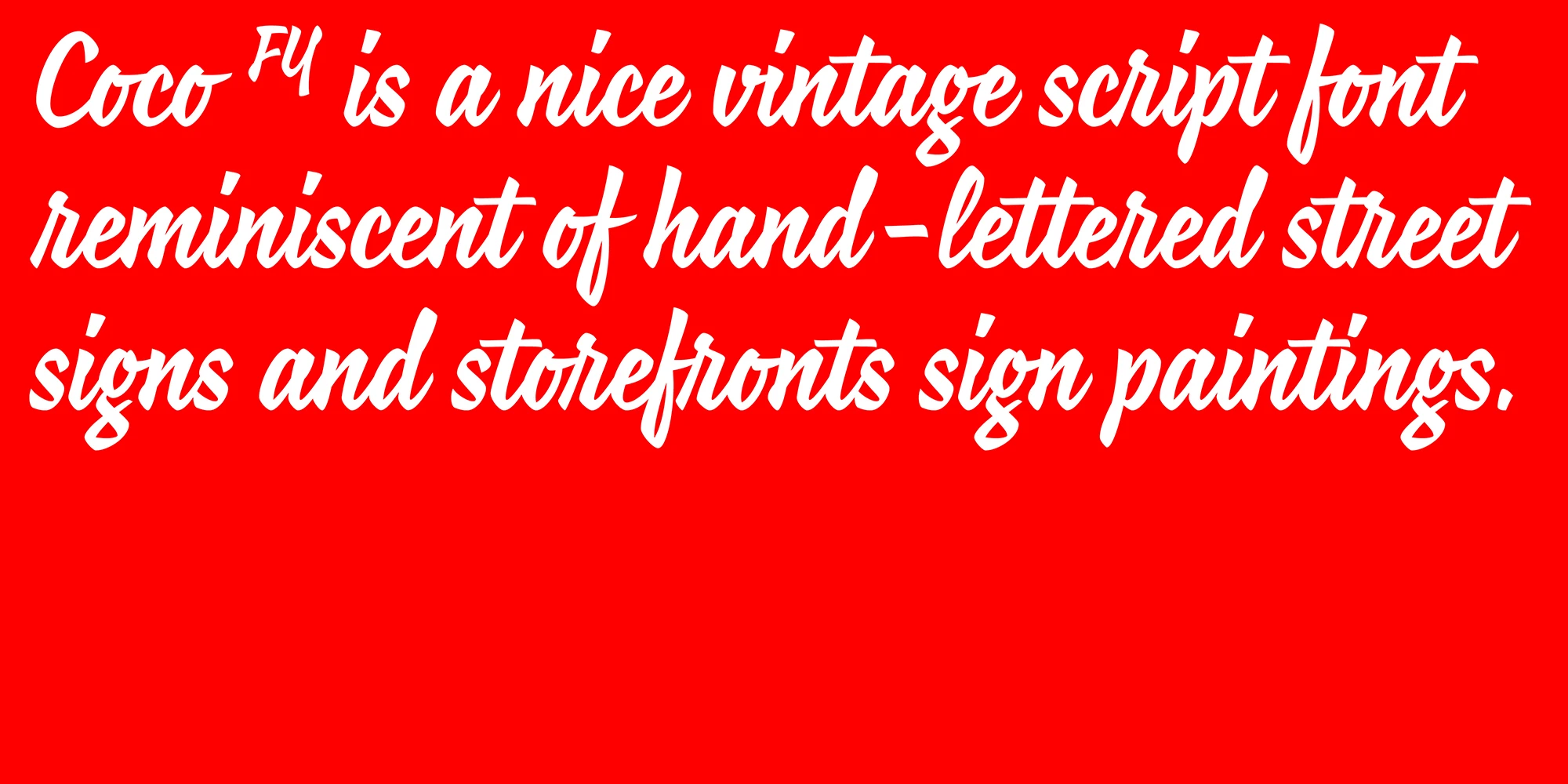 Coco FY is a vintage script font reminiscent of storefront fascia and other hand-lettered street signs. With highly expressive, condensed forms, it has a retro style that adds original character and charm to designs. Suited for posters, packaging, and branding, it is also a great choice for editorial projects seeking a touch of retro panache, offering designers a versatile script with timeless appeal and personality.