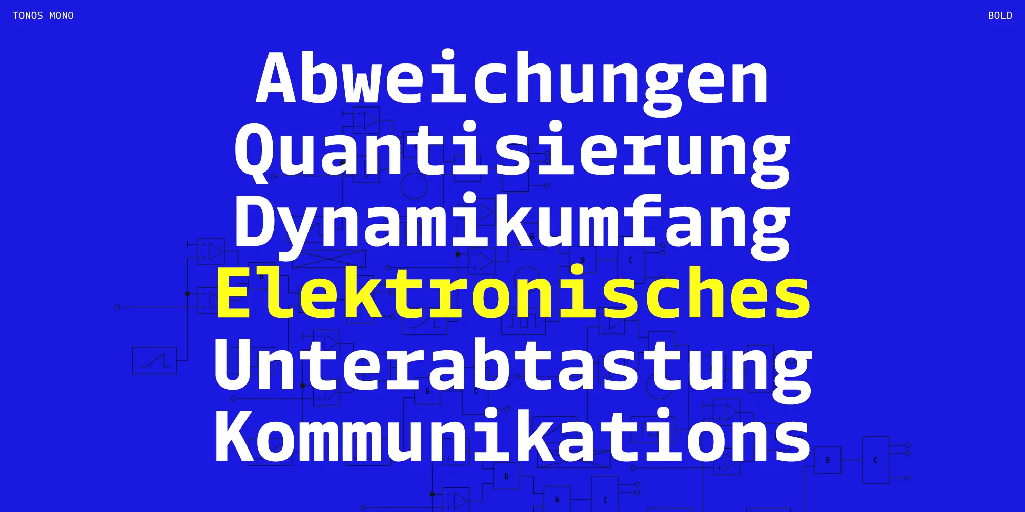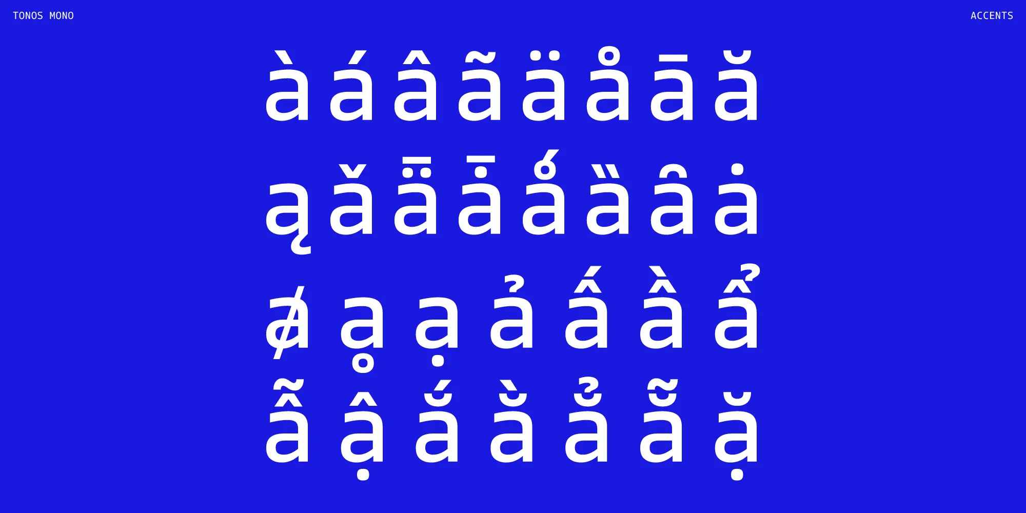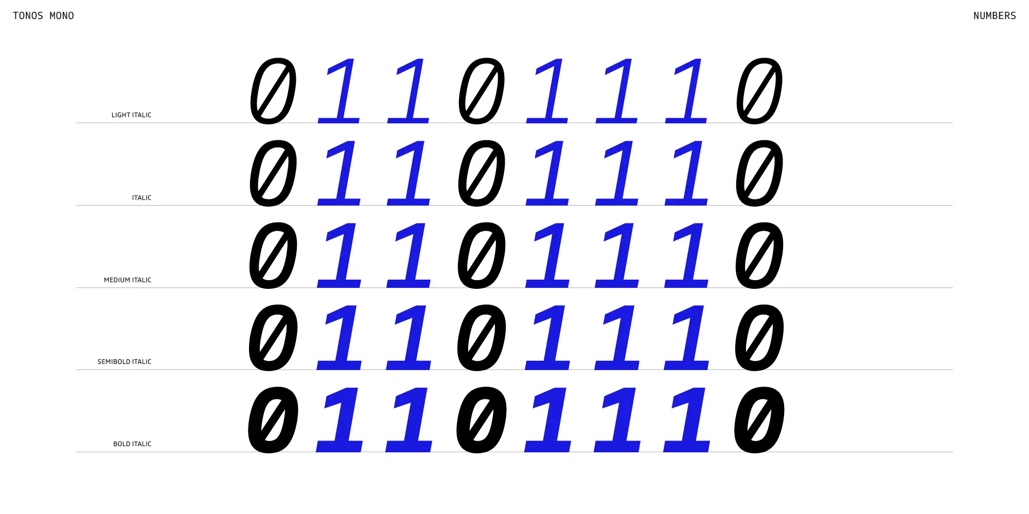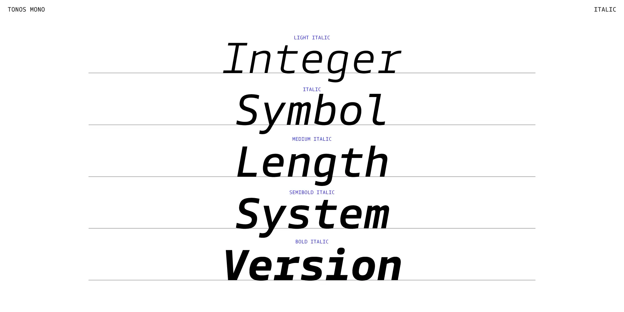 Tonos Mono is the monospace counterpart of Tonos, designed for UI and HMI contexts and supporting Latin, Cyrillic, and Greek. Its glyph design has calligraphic roots, giving it a warm, humanistic quality carried across all scripts for harmony and legibility. Available in weights from Light to Bold with true italics, it is both sturdy and engaging. Developed over years, Tonos Mono combines functionality, style, and language support, making it an excellent choice for modern interface typography.