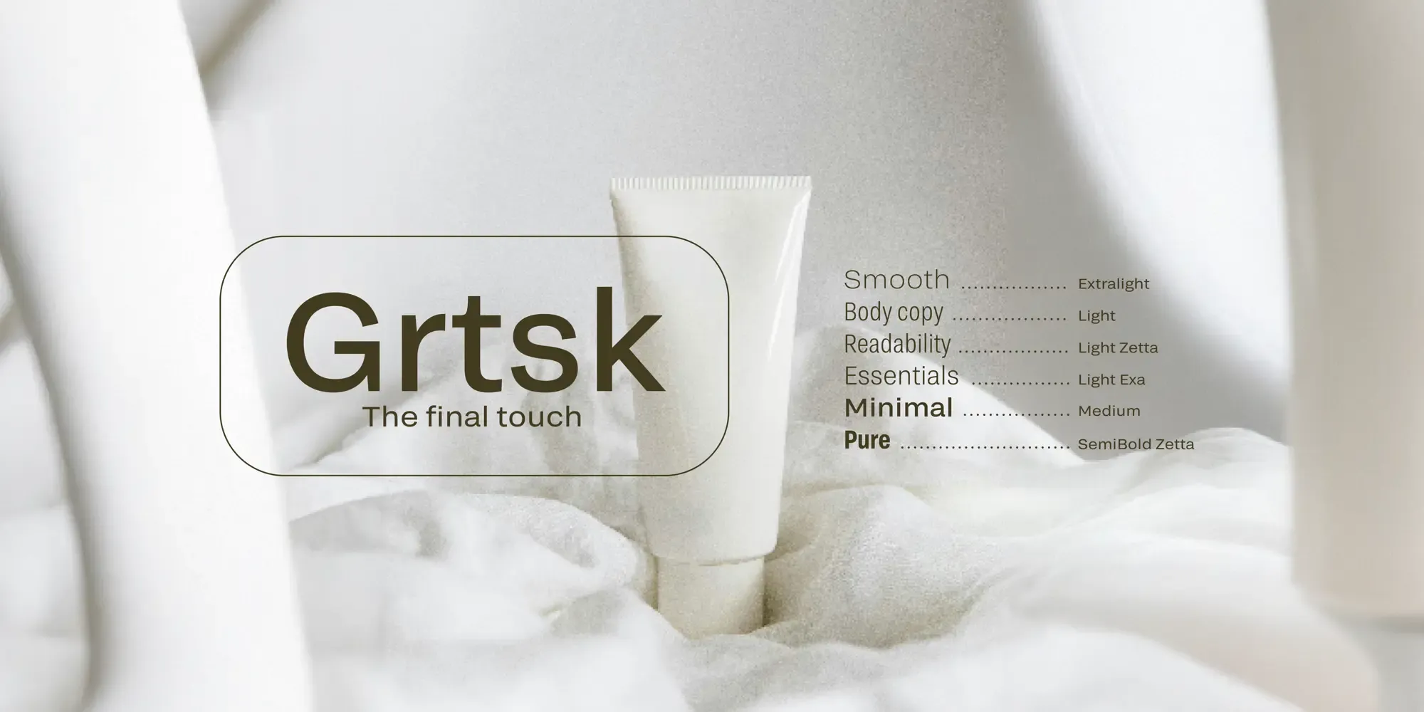 - Legibility Meets Chic: Whether it’s on your product’s legal disclaimers or Instagram captions, Grtsk ensures your brand always looks polished, never plain.